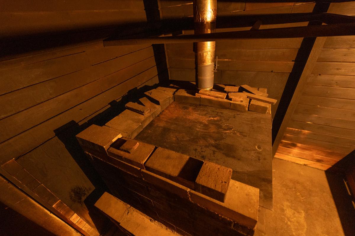 よく勘違いされるのですが、蔵サウナはスモークサウナではありません。スモークサウナといえば煙突がないタイプのサウナを指しますが、蔵サウナには煙突があります。 ストーブには薪焚き式の蓄熱型ストーブを採用しており、充分に時間をかけてサウナストーンを熱した後、蓋を開放し室温を上昇させます。このストーブはアトリエ・ナカウテによるDIY施工によって作られたオリジナルのストーブです。